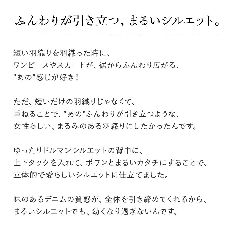 短い羽織りを羽織った時に、ワンピースやスカートが、裾からふんわり広がる、"あの"感じが好き!ただ、短いだけの羽織りじゃなくて、重ねることで、"あの"ふんわりが引き立つような、女性らしい、まるみのある羽織りにしたかったんです。